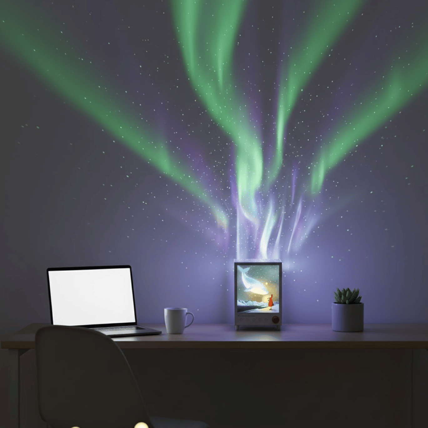 The "Dreamscape" Aurora Projector is a stunning Framed Light Art piece, projecting magical Aurora Borealis effects onto your ceiling and walls. But it's so much more! It's also a powerful Bluetooth speaker for your music and comes with 7 soothing white noise sounds built-in. Choose between the whimsical "Whale of the Starry Seas" or the serene "Aurora Guardian" (Polar Bear) scenes.